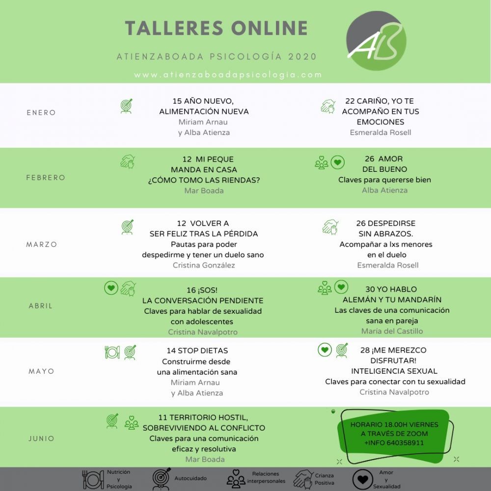 Tenemos una amplia trayectoria impartiendo talleres monotemáticos con el objetivo de desarrollar habilidades y estrategias concretas para mejorar en algún área específica promoviendo el bienestar de la persona. Realizamos talleres de desarrollo personal (autocuidado, gestión emocional, planificación del tiempo, comunicación asertiva…), talleres relacionados con la crianza positiva (manejo de límites, hábitos de sueño, impacto del proceso de divorcio en los menores, hábitos de alimentación…) y talleres de educación sexual (para formadores, para menores y específicos para población adulta).